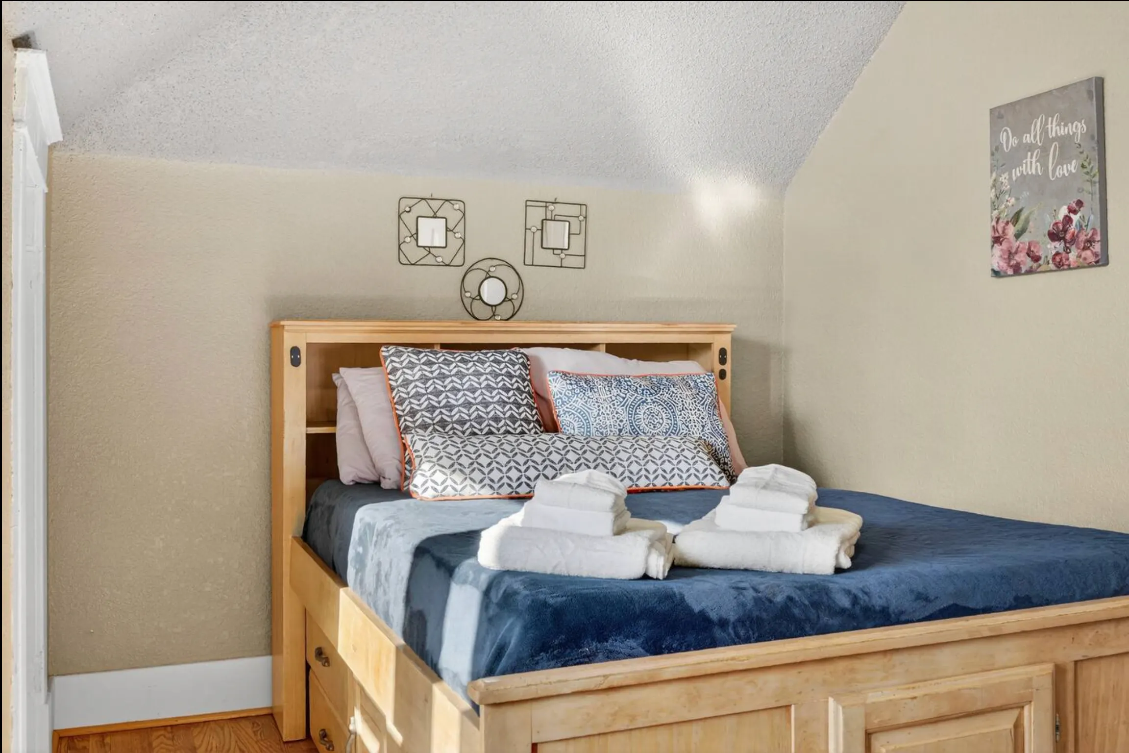 The middle bedroom wraps you with warmth, from its wonderful full size bed with under bed drawers and bookcase headboard, to the funky and functional study area. Storage abounds, with a walk in closet and armoire with baskets to tuck away your belongings in style.