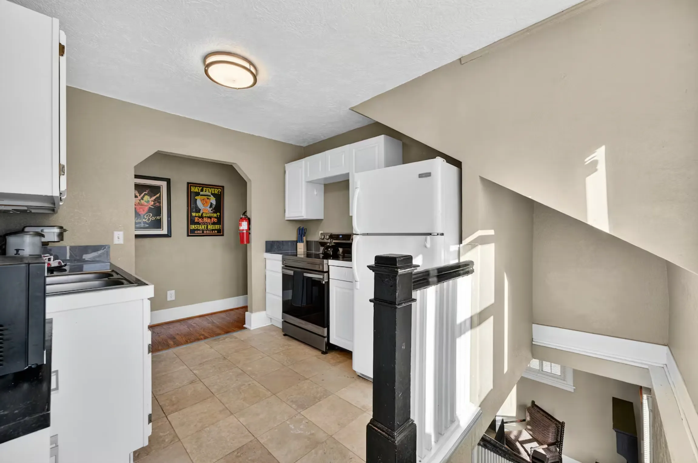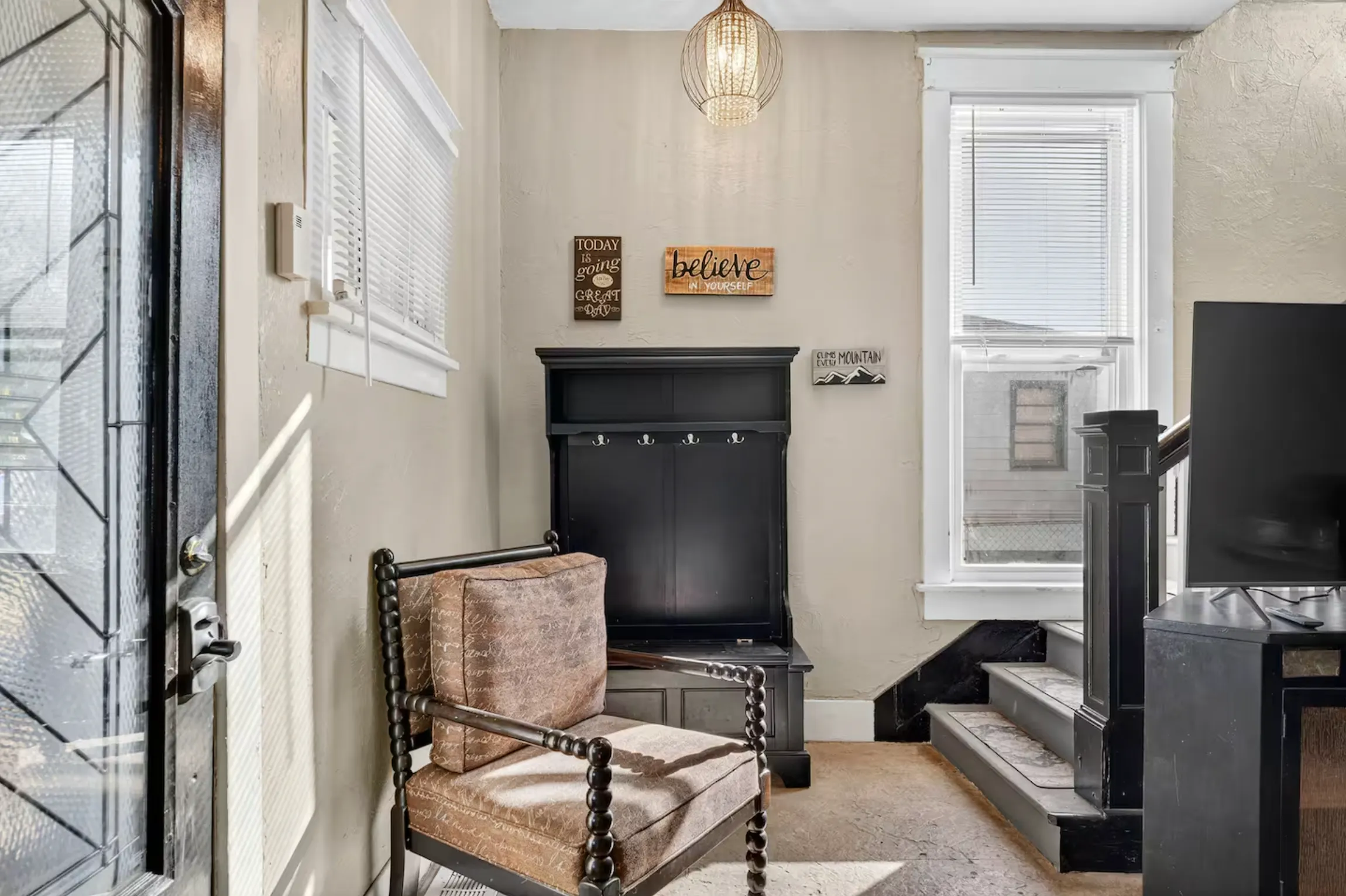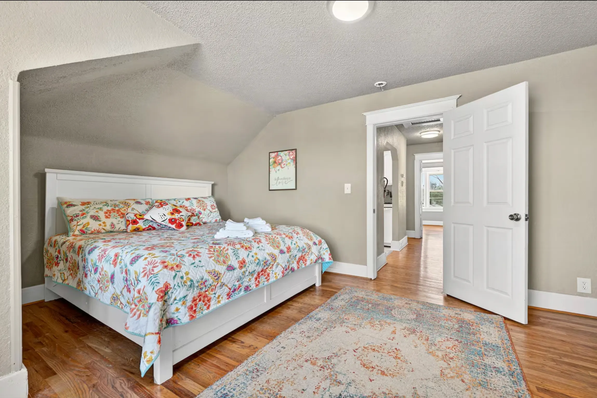 Up the stairs of this historic beauty, you enter the light and bright full kitchen, decorated with a fun lemon motif that inspires you to create delectable delights. Through the hallway, decorated with an art deco design, you will find three bedrooms, each with its own unique welcoming vibe.