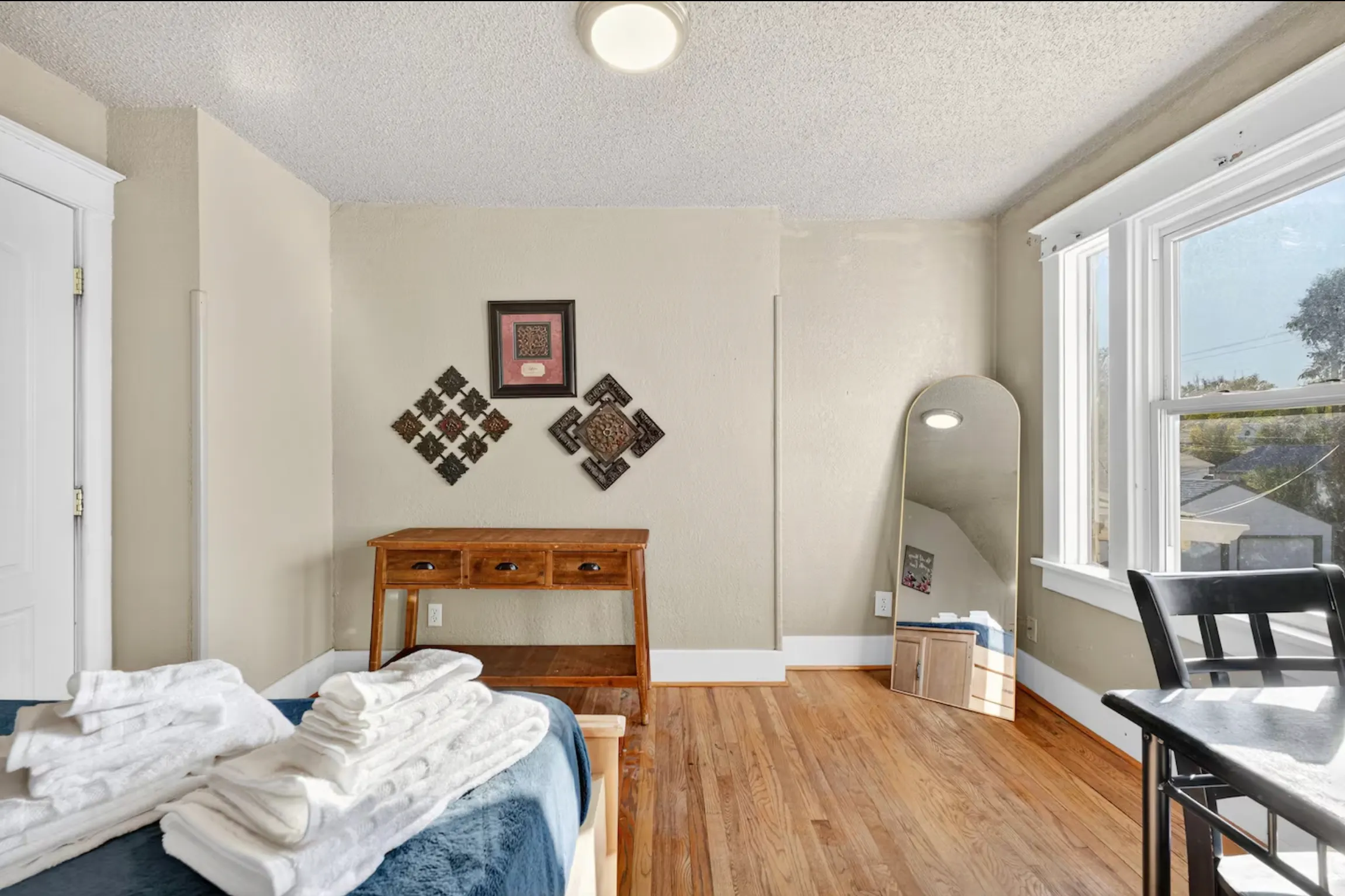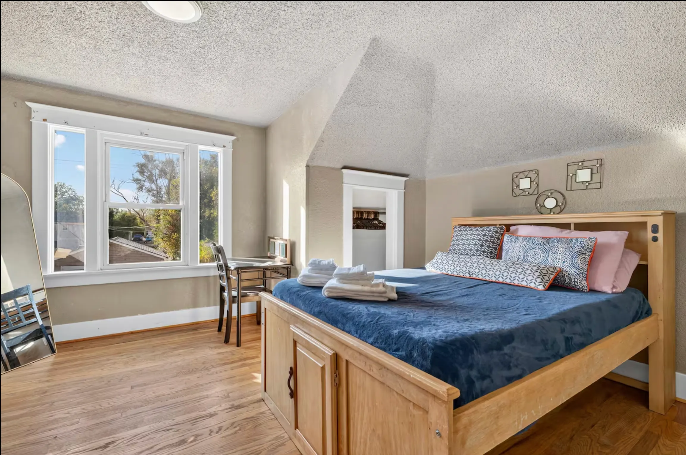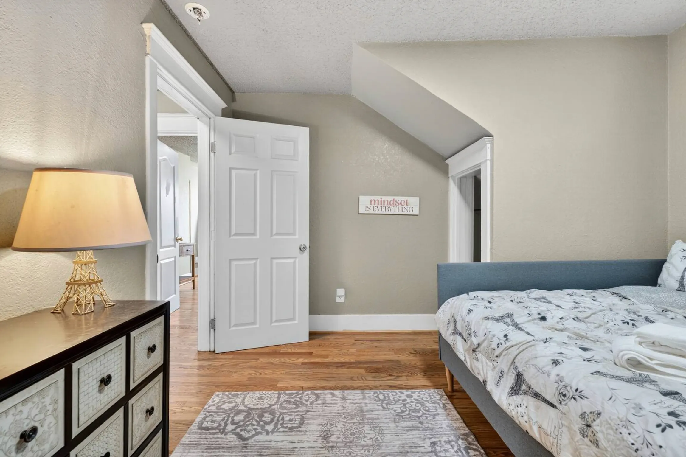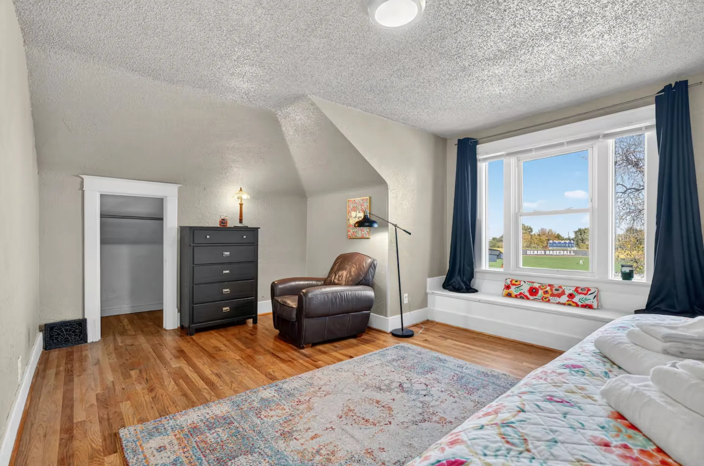 The largest bedroom will brighten your day, with the pop of flower power from the kingsize bed and window seat, to the cozy leather lounge chair that encourages you to grab a book and breathe easy. With a walk in closet and ample space, you may never want to leave this sanctuary.