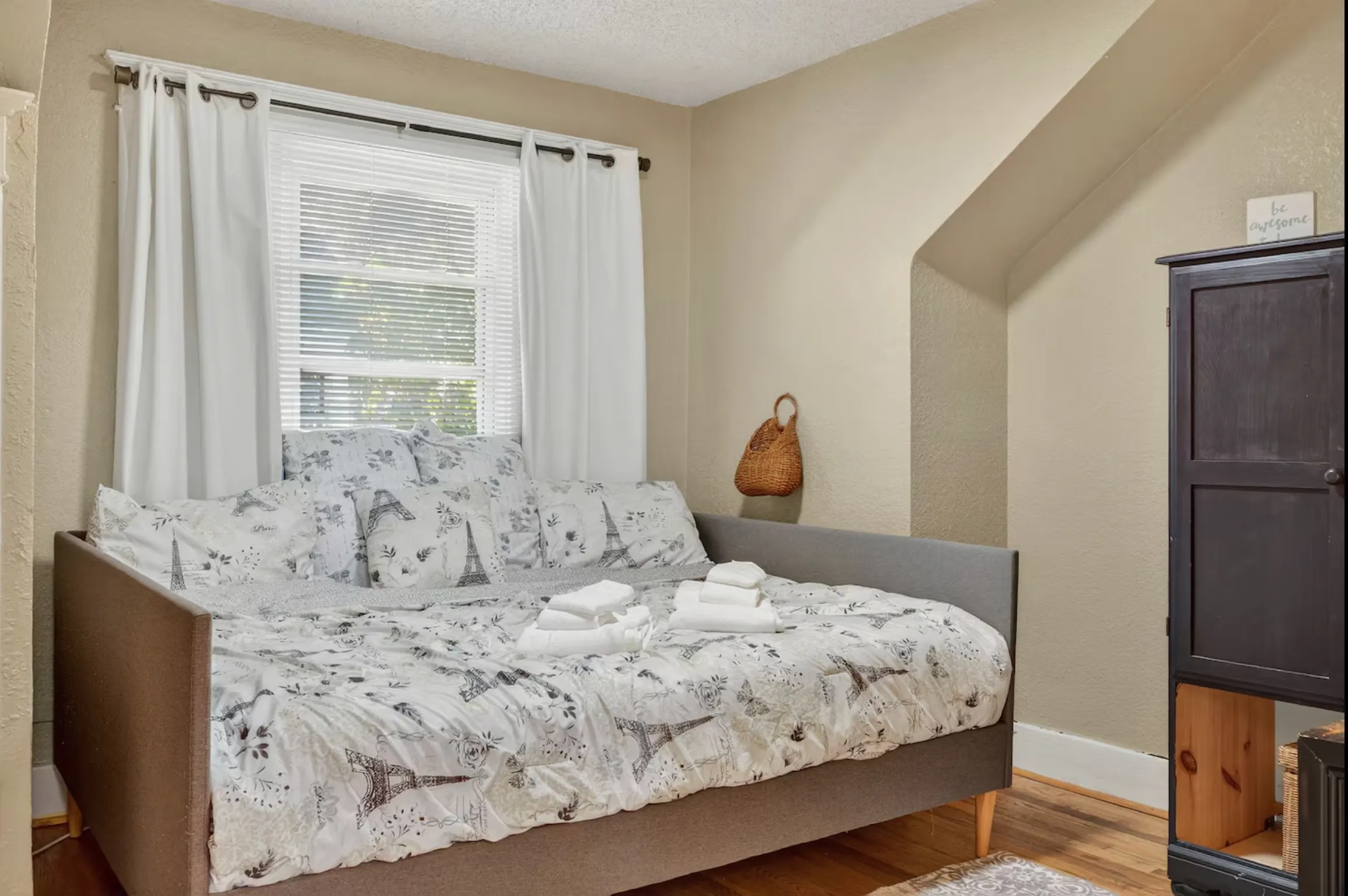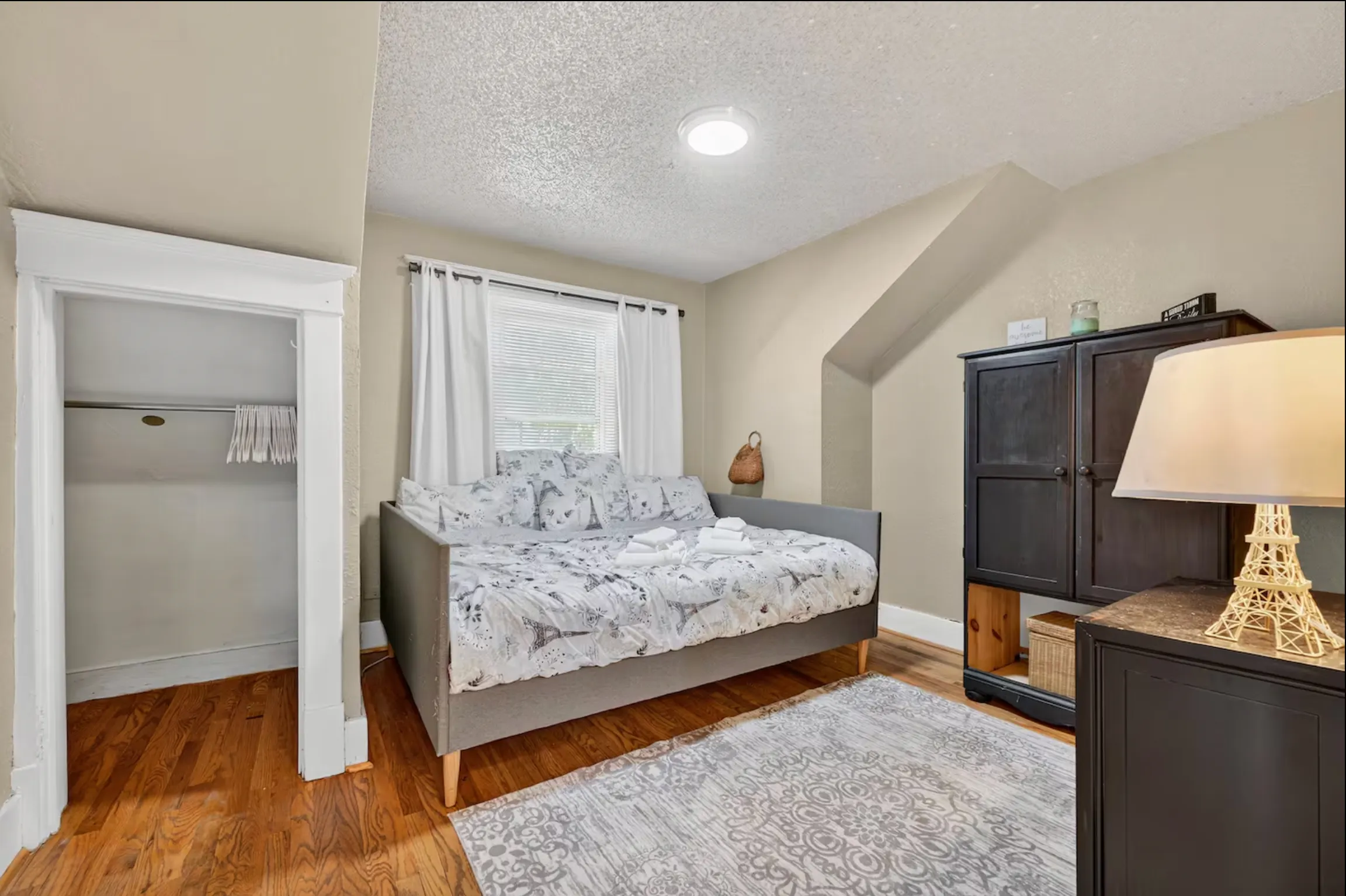 The third sleeping area is bathed in European wonder, with a Paris theme that is sure to inspire you to travel, whether in your dreams or IRL. Furnished with a queen size daybed, you'll want to hop in and luxuriate. This room also has a walk-in closet, two dressers and room to spare for studying or just chilling.